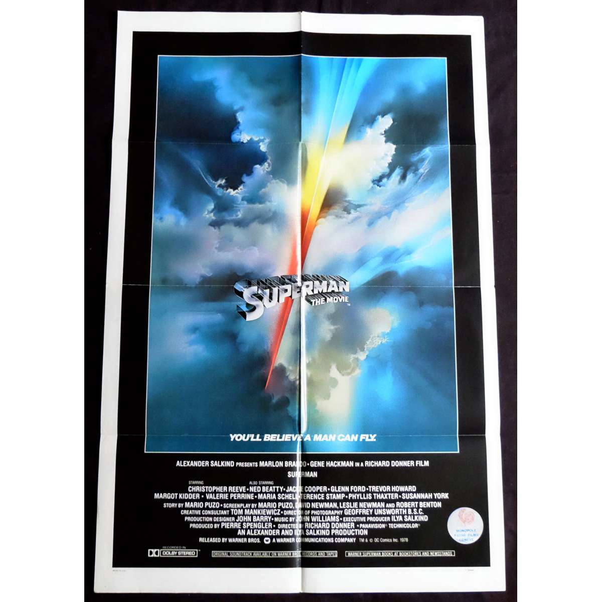 SUPERMAN Movie Poster directed by Richard Donner with Christopher Reeves. Intl. - Size: 29x41 inches approx. Condition: Good to Very good (C5) Pinholes, tears, wear on borders, but still displays nicely