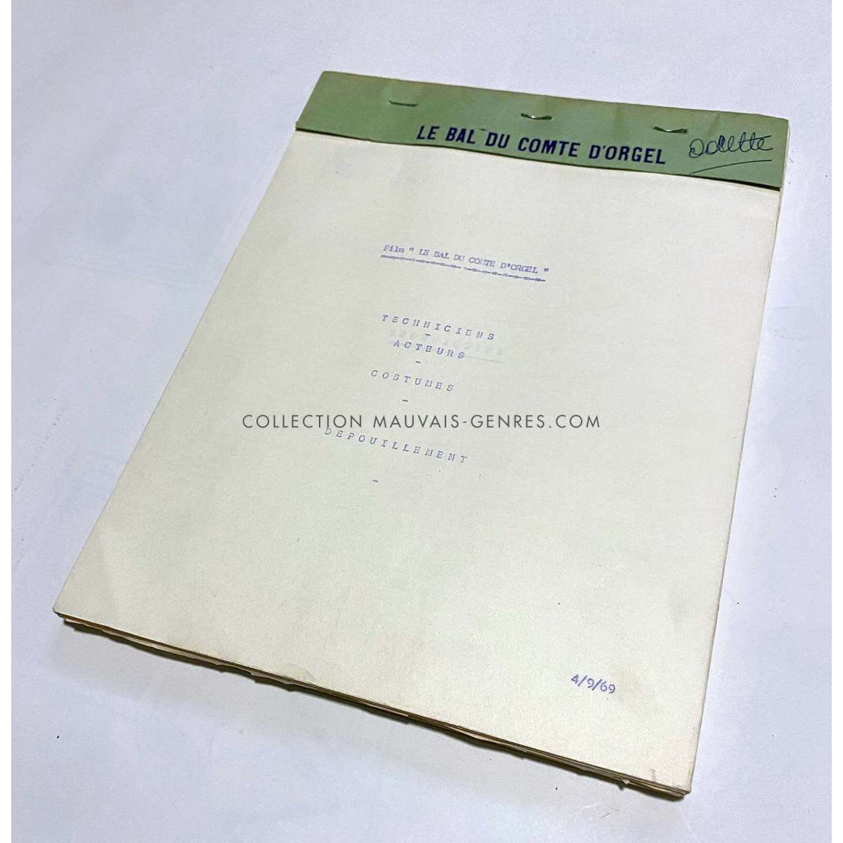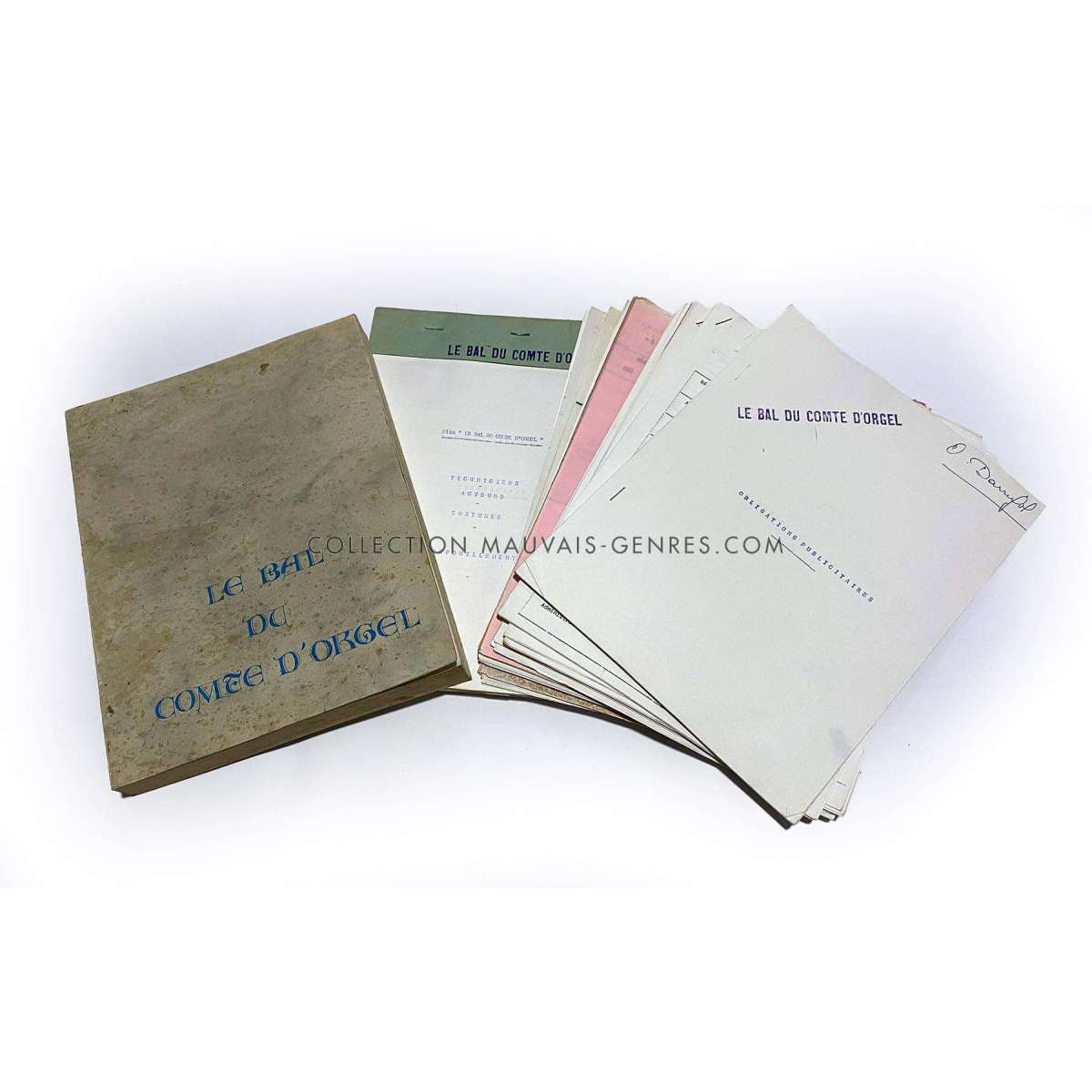 LE BAL DU COMTE D'ORGEL Movie Script - 163p. (1970 - France - Marc Allégret, Jean-Claude Brialy) - Size: 9x12 in. Approx. - French language - Condition: Very good (C6), stains on cover. The script belonged to the production manager of the film O. Darrigol (The Widow Coudert, Farewell my Friend...). The lot includes the script (163 p.) used for filming, and various production documents.