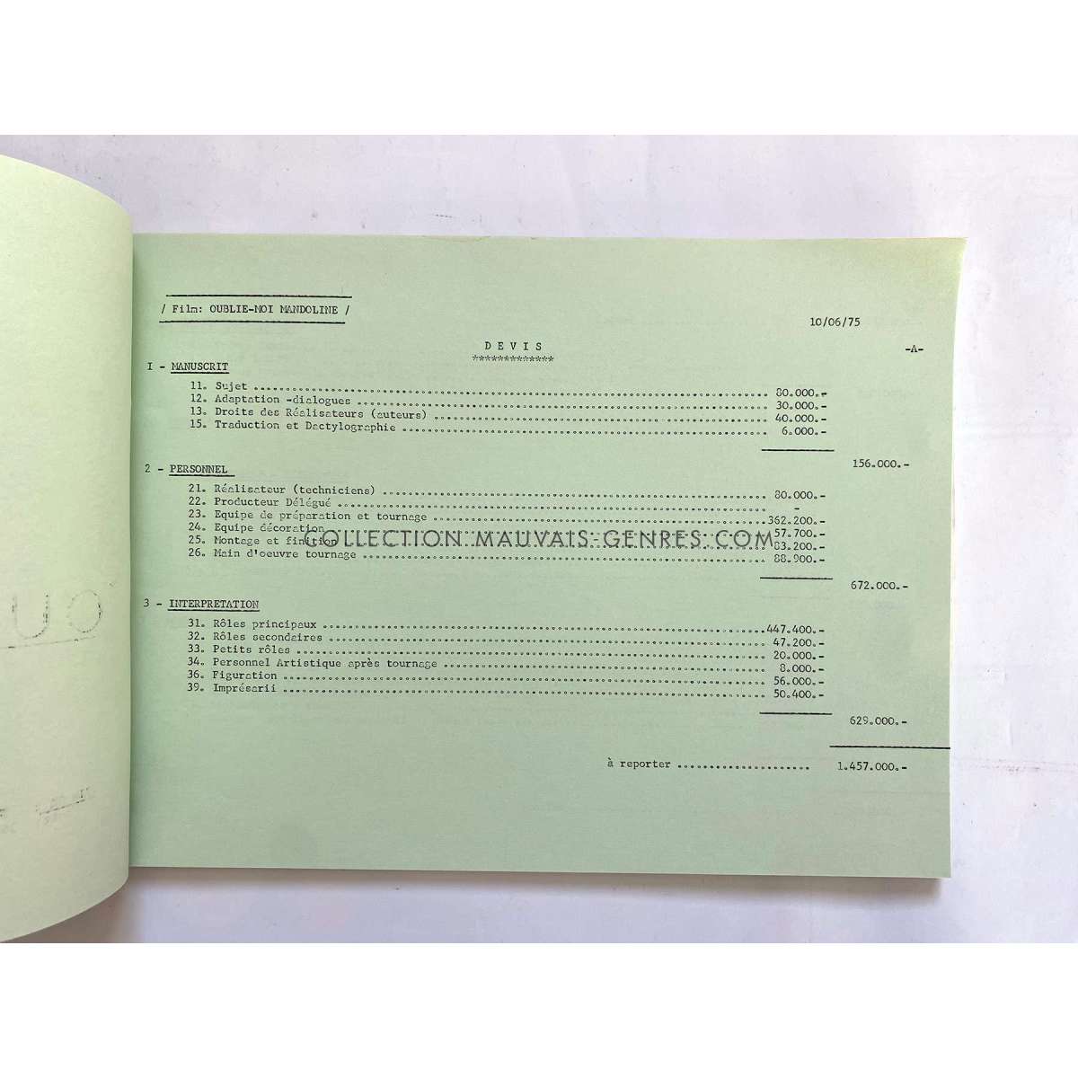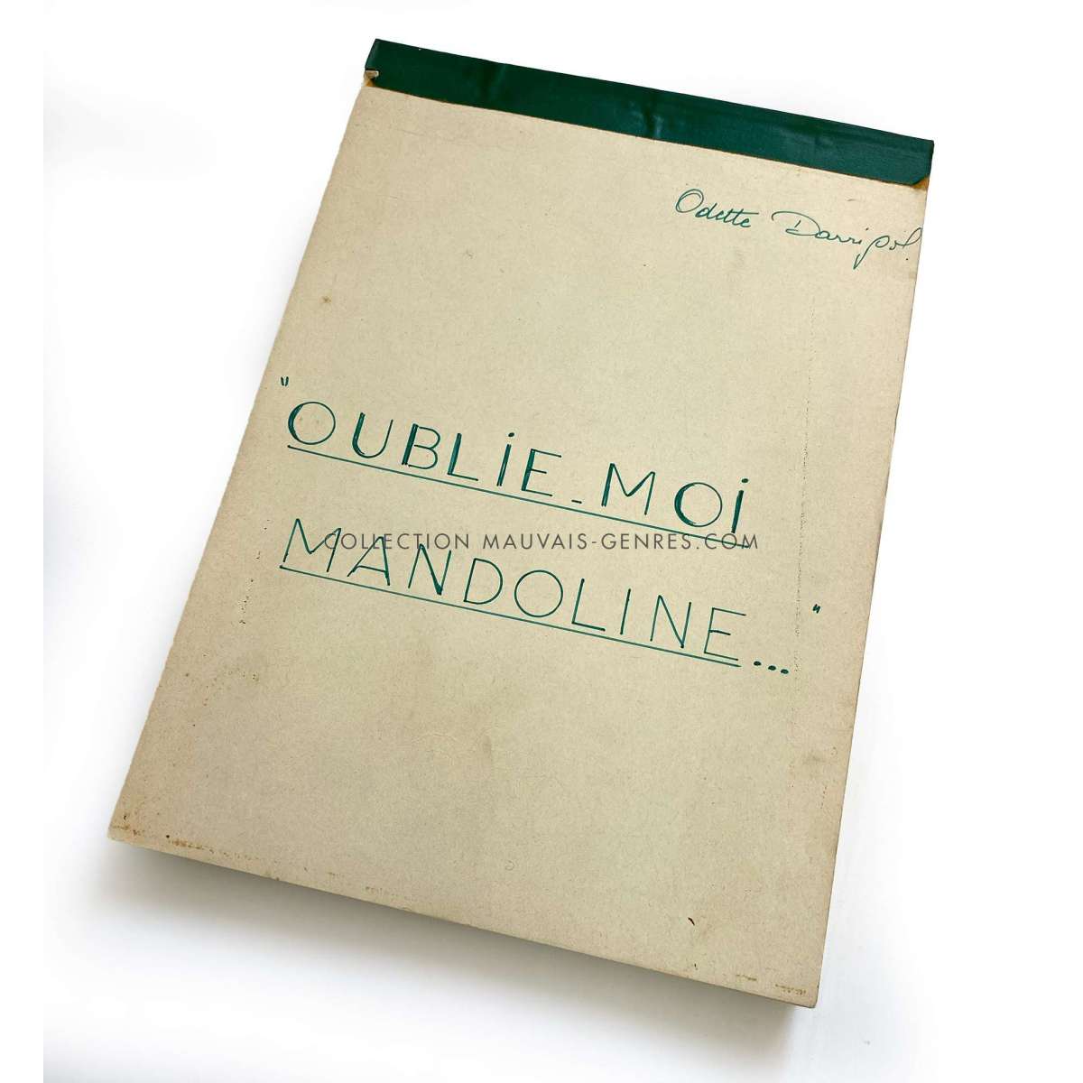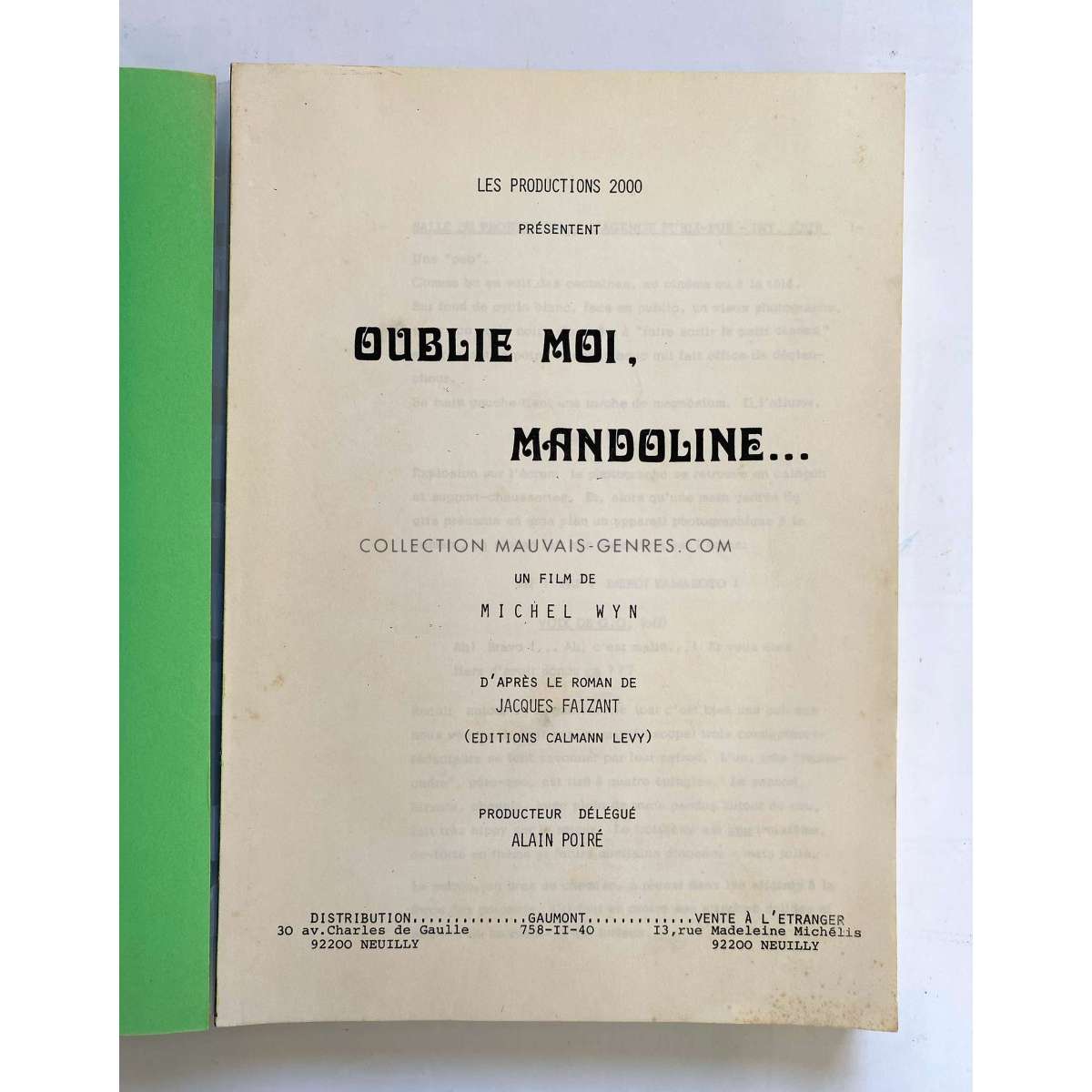 OUBLIE-MOI MANDOLINE Movie Script - 152p (1976 - France - Michel Wyn, Bernard Menez) - Size: 9x12 in. Approx. Condition: Very good (C6) This Movie Script belonged to the production manager of the film O. Darrigol (The Widow Coudert, Farewell my Friend...). Including other production documents.