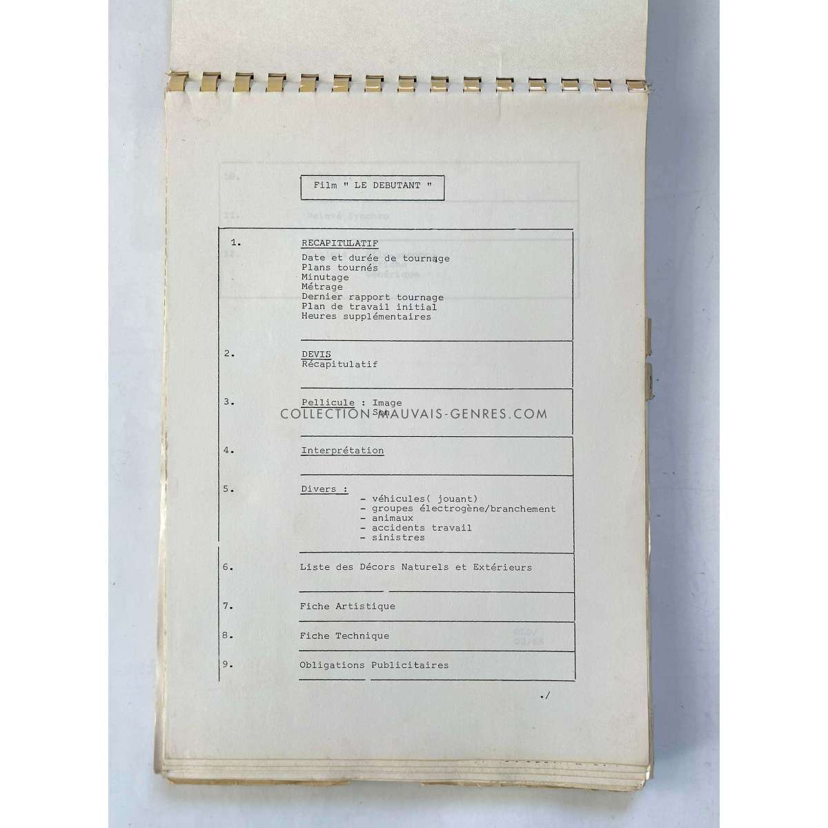 LE DEBUTANT Production Documents - (1986 - France - Daniel Janneau, Francis Perrin) - Size: 9x12 in. Approx. Condition: Very good (C6) These documents belonged to the production manager of the film O. Darrigol (The Widow Coudert, Farewell my Friend...).