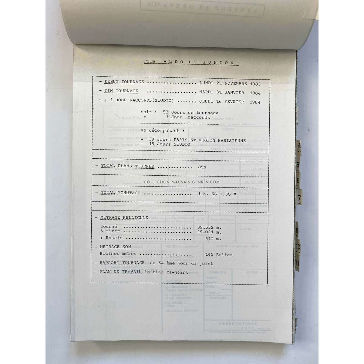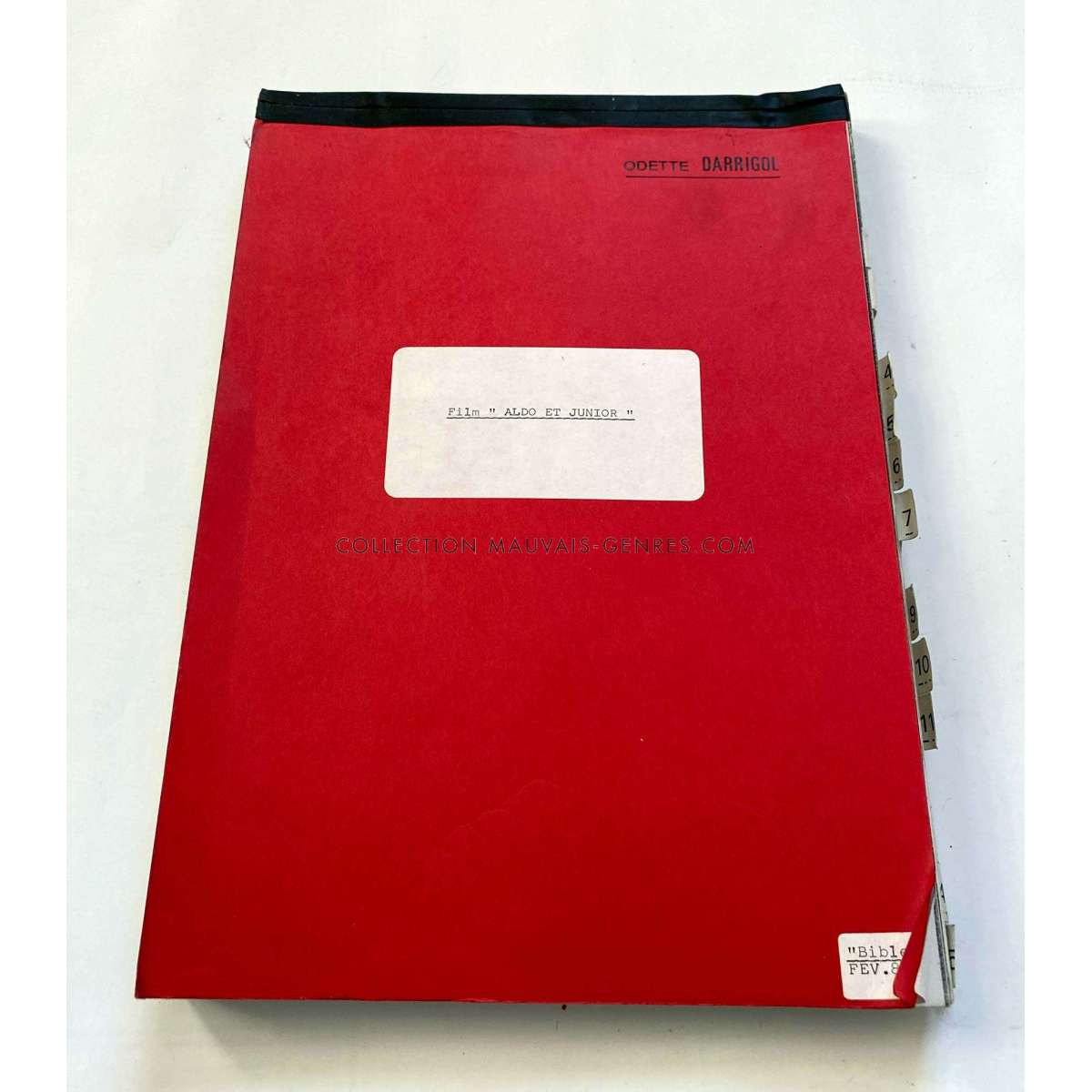 ALDO ET JUNIOR Production-used Bible - (1984 - France - Patrick Schulmann, Aldo Maccione) - Size: 9x12 in. Approx. Condition: Very good (C6) This Production Bible belonged to the production manager of the film O. Darrigol (The Widow Coudert, Farewell my Friend...). The package includes the production bible and some documents used for filming. French Language.