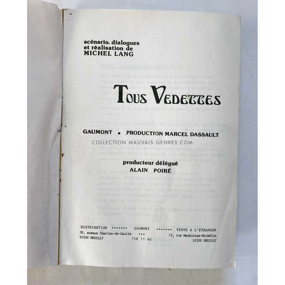 TOUS VEDETTES Production-Used Movie Script and Bible - (1980 - France - Michel Lang, Leslie Caron) - Size: 9x12 in. Approx. Condition: Very good (C6) This Movie script belonged to the production manager of the film O. Darrigol (The Widow Coudert, Farewell my Friend...). The package includes the script, the production bible and some documents used for filming. French Language.