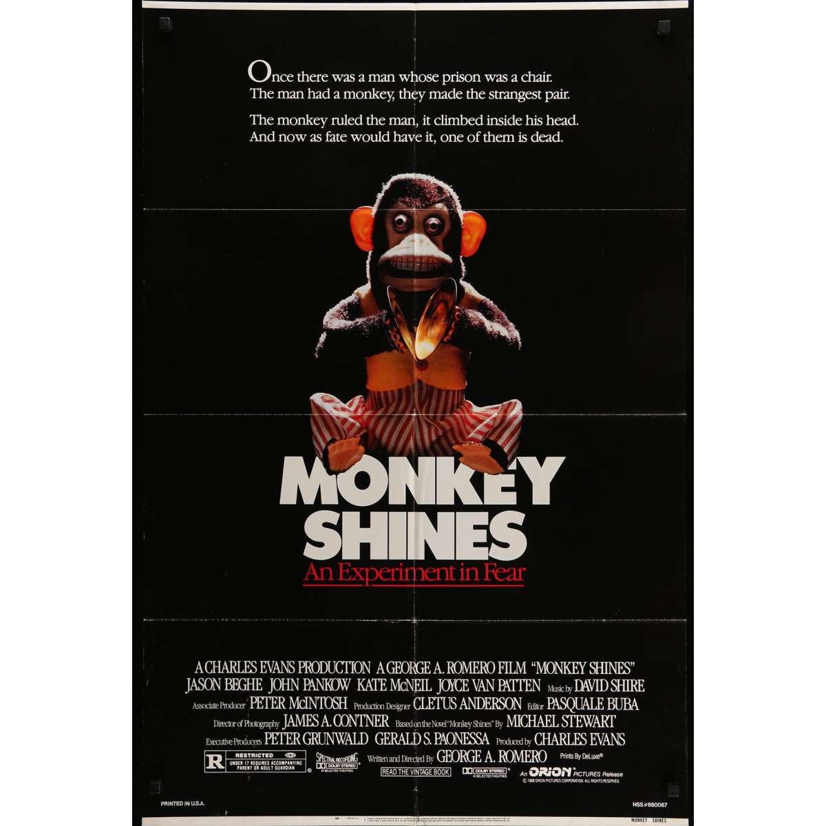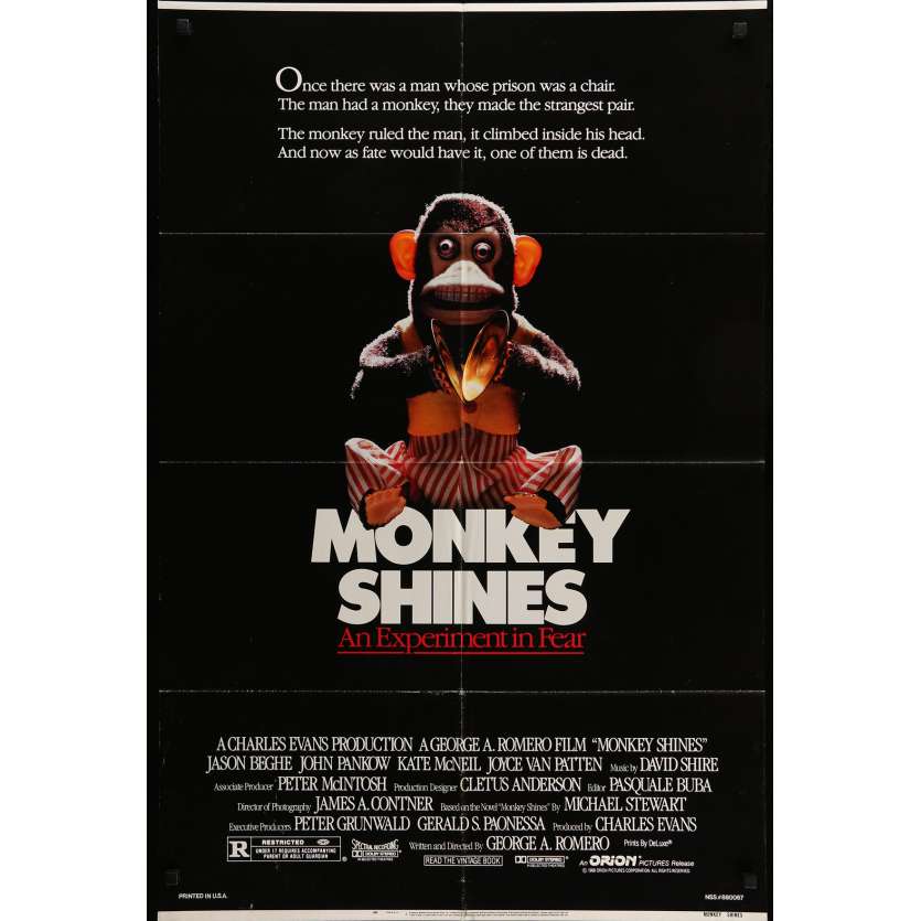 MONKEY SHINES Movie Poster. Directed by George A. Romero with John Pankow. 1988. - Size: 29x40 in. approx. Condition: Very good (C6), creases