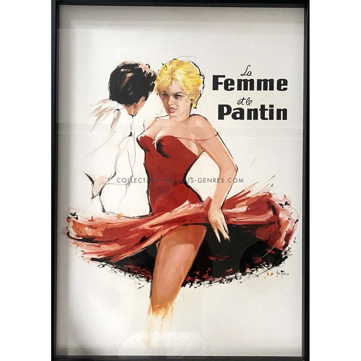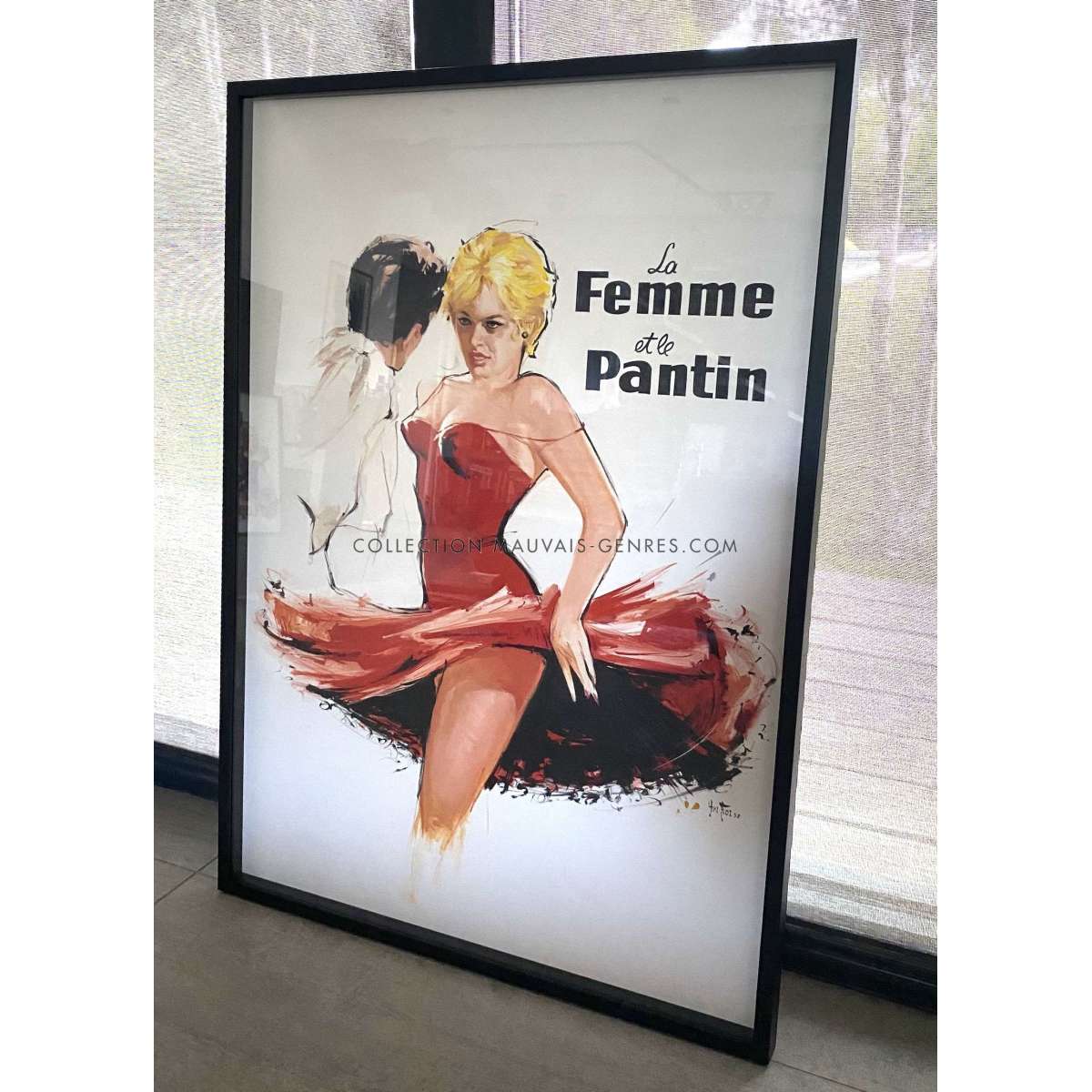 LA FEMME ET LE PANTIN Peinture originale de Yves Thos ayant servi de maquette à l'affiche culte du film de Julien Duvivier avec Brigitte Bardot (1958). Oeuvre réalisée à la gouache, signée, UNIQUE AU MONDE ! Format 59x84 cm env. Vendue encadrée. Excellent état (C8) avec certificat de provenance