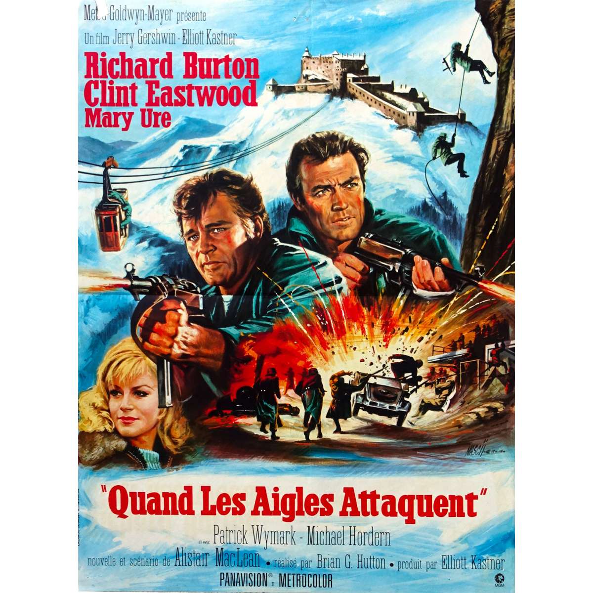Affiche de cinéma Française de QUAND LES AIGLES ATTAQUENT (WHERE EAGLES DARE) de Brian G. Hutton avec Clint Eastwood, Richard Burton. 1968 - Format: 40x60 cm. environ. - Etat correct (C5) petite perte de matière en haut à gauche, punaises, petites déchirures