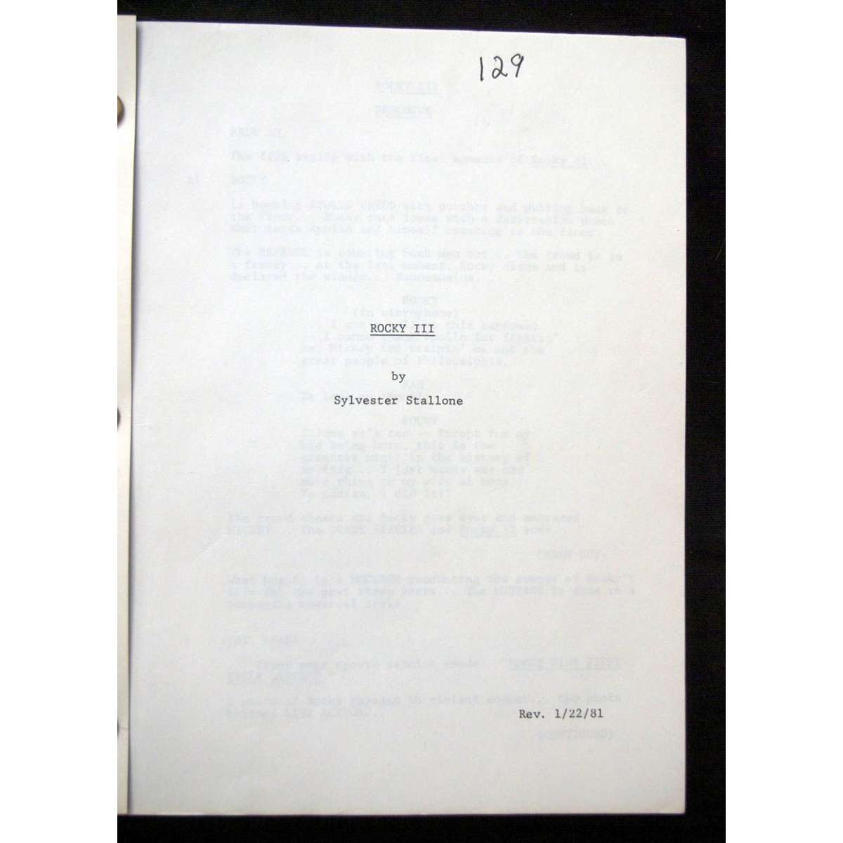 Scénario Original de Rocky III. Ecrit par Sylverster Stallone. Daté du 22 janvier 1981. 127 pages multicolores + en bonus une trentaine de pages de révision non incluses dans le script.
