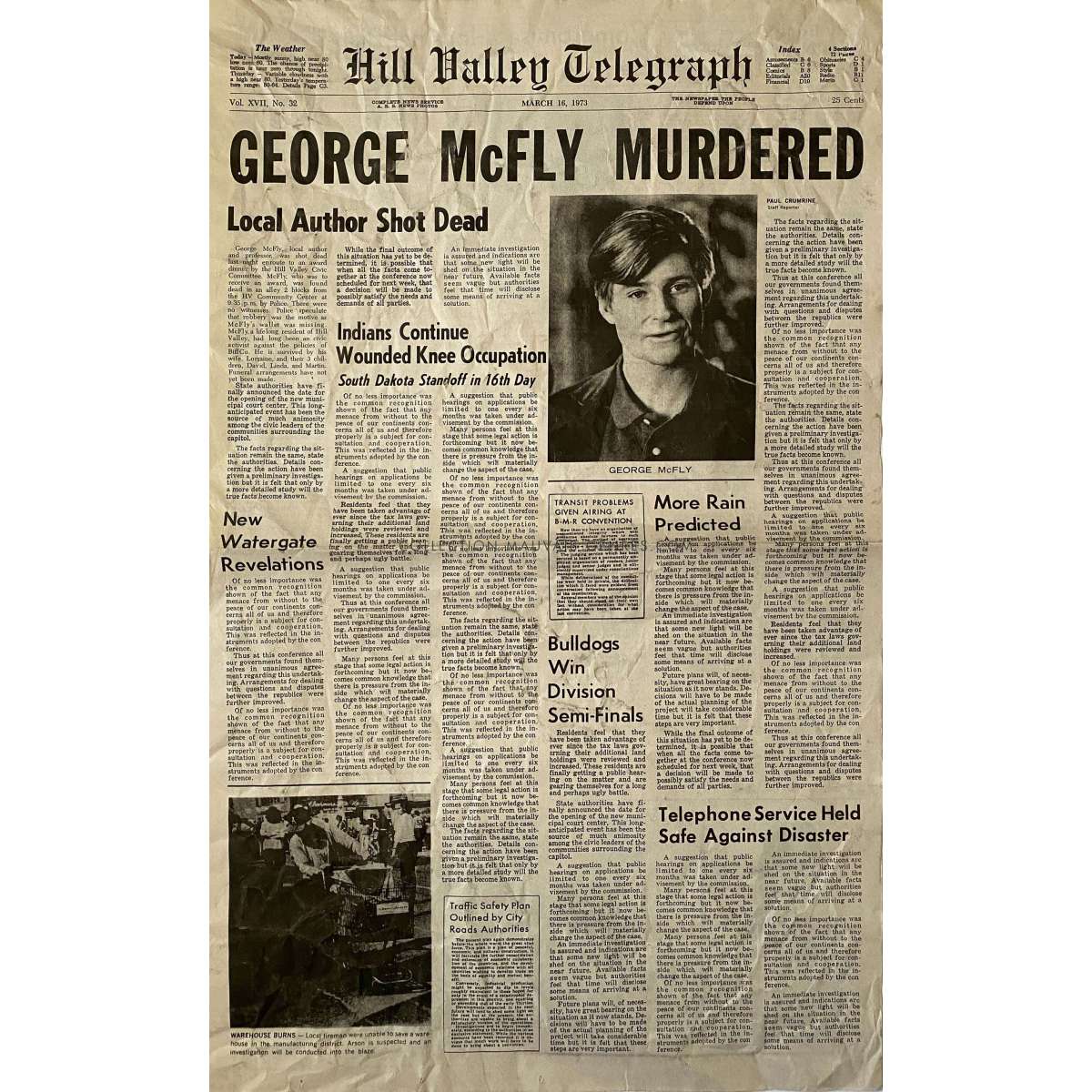 Réplique des Journaux de RETOUR VERS LE FUTUR de Robert Zemeckis avec Michael J. Fox. Format respecté, Sur papier journal. Comprend 2 journaux différents : George McFly murdered (/ assassiné) / George McFly honored (/ honoré). Etat correct (C5) déchirures, jauni, froissements DERNIERS EXEMPLAIRES !