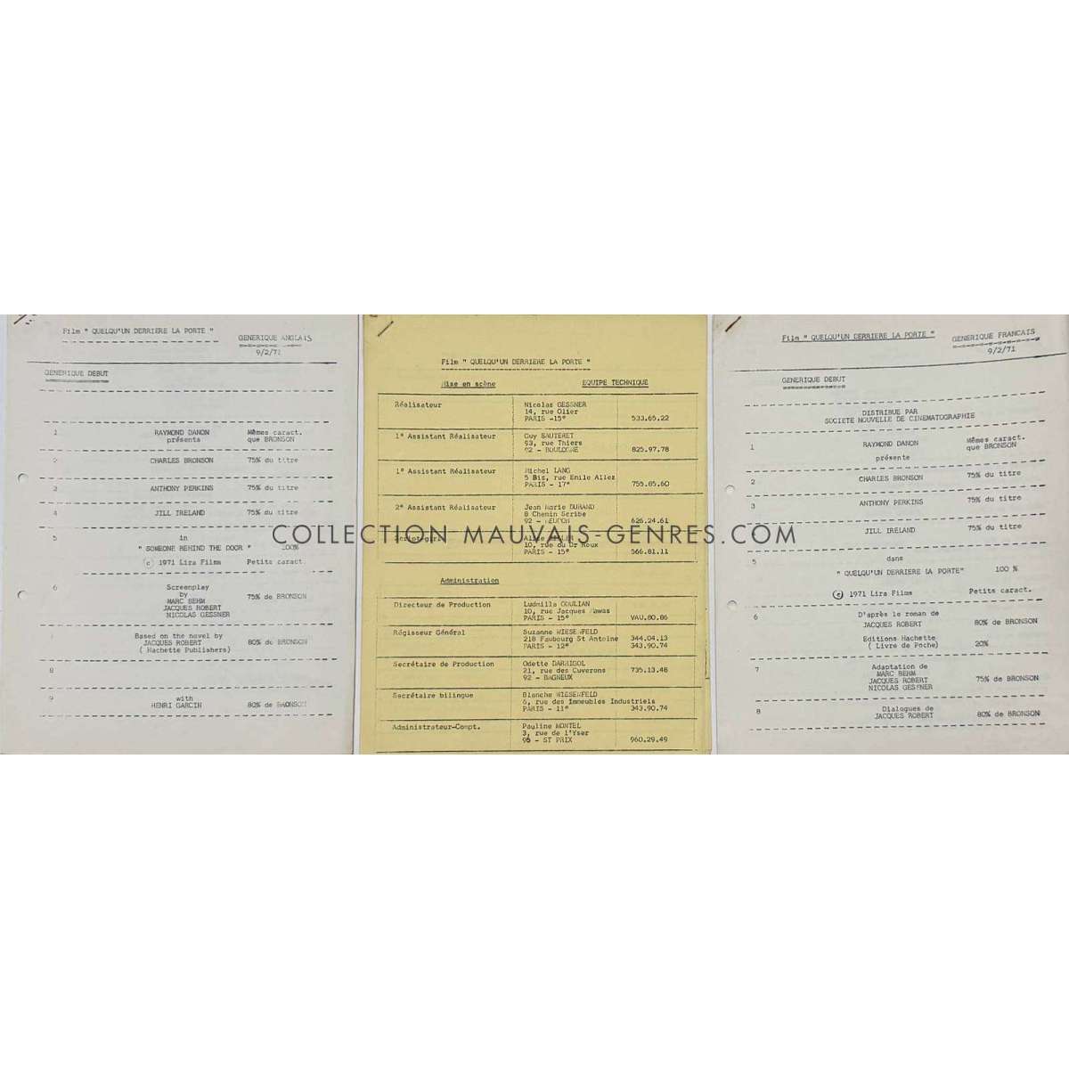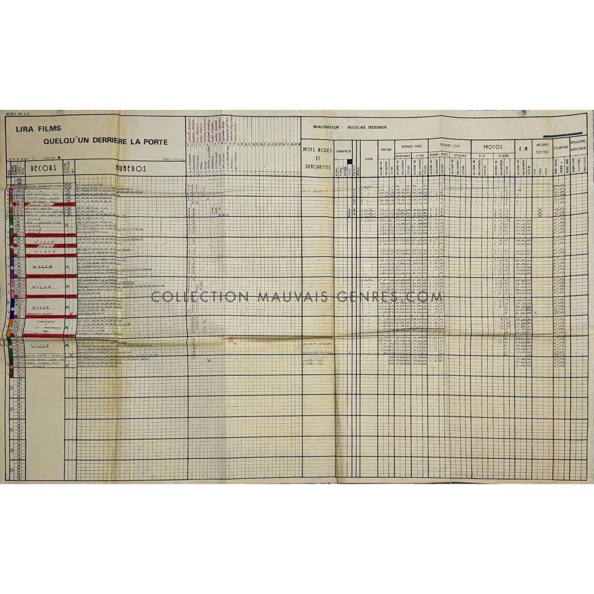 Très rare ! Scénario Original (en langue française) et documents de production de QUELQU'UN DERRIERE LA PORTE (QUELQU'UN DERRIERE LA PORTE - 1971 - Nicolas Gessner, Charles Bronson) - Format: 21x30 cm. environ. - Très bon état (C6) Rare exemplaire ayant appartenu à la responsable de production du film O. Darrigol (La Veuve Coudert, Adieu l'Ami…). Ce lot comprend le scénario de 120p utilisé pendant le tournage du film, un plan de travail original et divers documents sur la conception du générique.