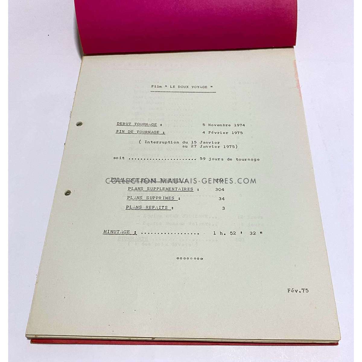 Documents de production français de PAS DE PROBLEME (Titre provisoire : LE DOUX VOYAGE DE MR MICHALON - 1975 - Georges Lautner, Miou-miou) - Format: 21x30 cm. environ. - Très bon état (C6) documents ayant appartenu à la responsable de production du film O. Darrigol (La Veuve Coudert…).