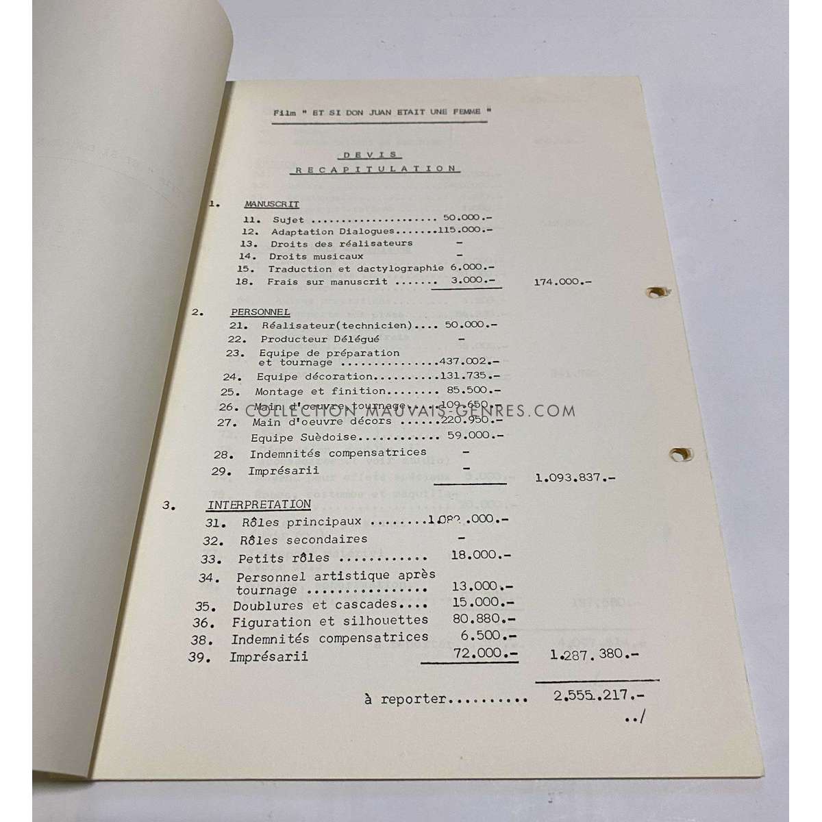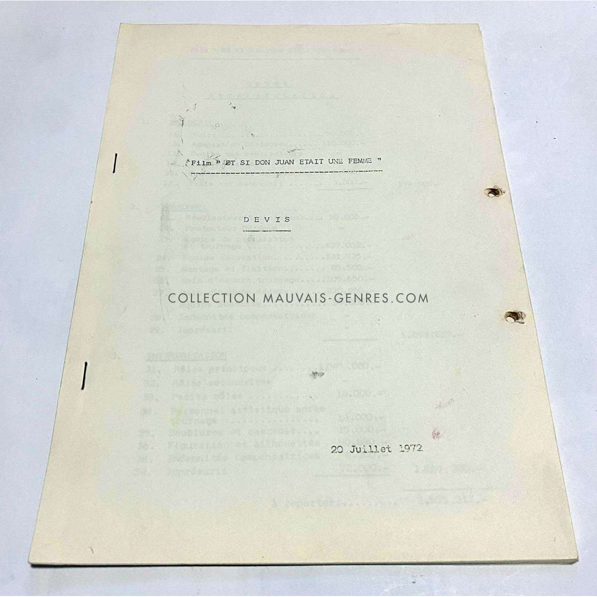 Documents de production de ET SI DON JUAN ETAIT UNE FEMME (ET SI DON JUAN ETAIT UNE FEMME - 1973 - Roger Vadim, Brigitte Bardot) - Format: 21x30 cm. environ. - Très bon état (C6) Documents ayant appartenu à la responsable de production du film O. Darrigol (La Veuve Coudert…).