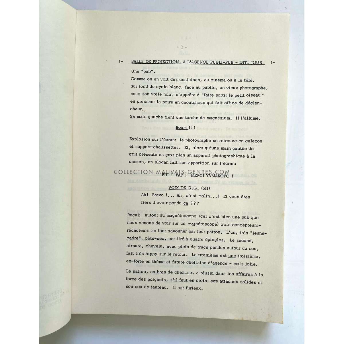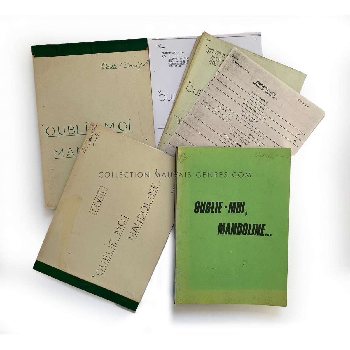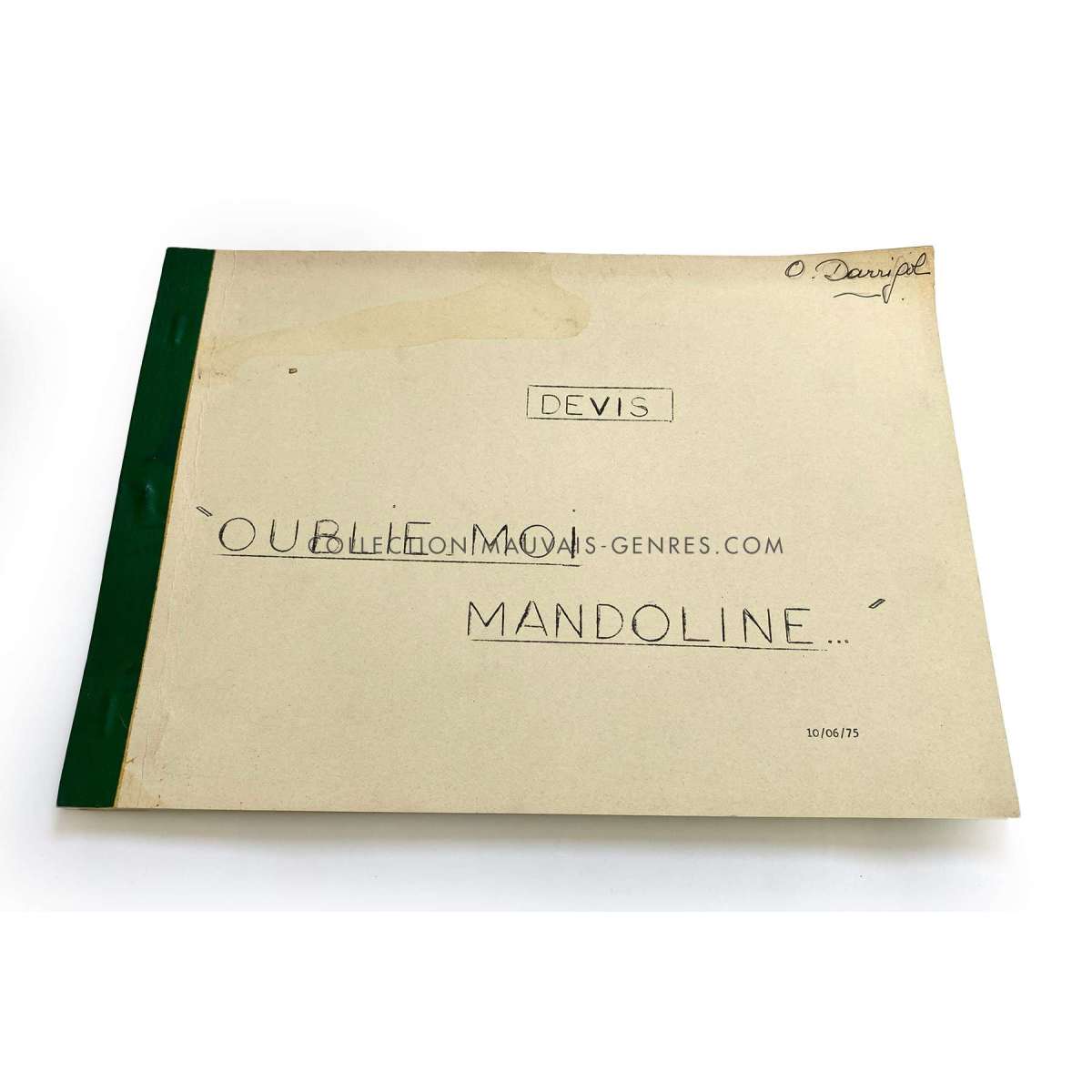 Scénario français de OUBLIE-MOI MANDOLINE (1976 - Michel Wyn, Bernard Menez) 152p - Format: 21x30 cm. environ. - Très bon état (C6) Rare scénario ayant appartenu à la responsable de production du film O. Darrigol (La Veuve Coudert…). Le lot comprend le scénario utilisé pour le tournage et divers documents.