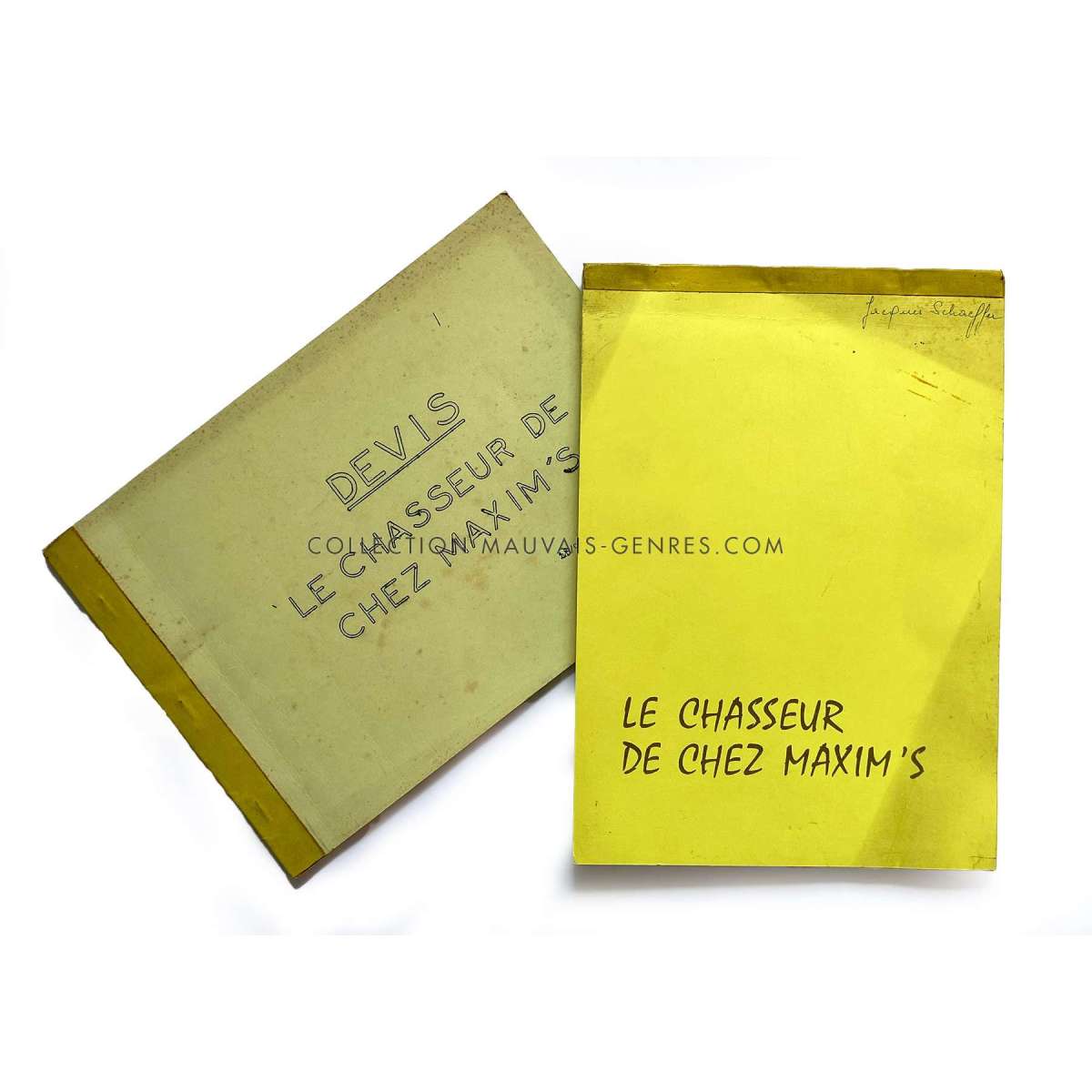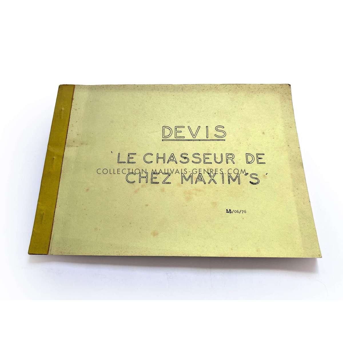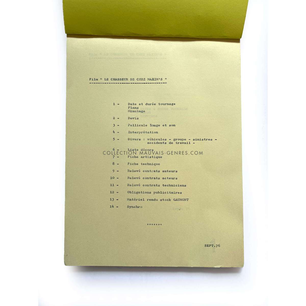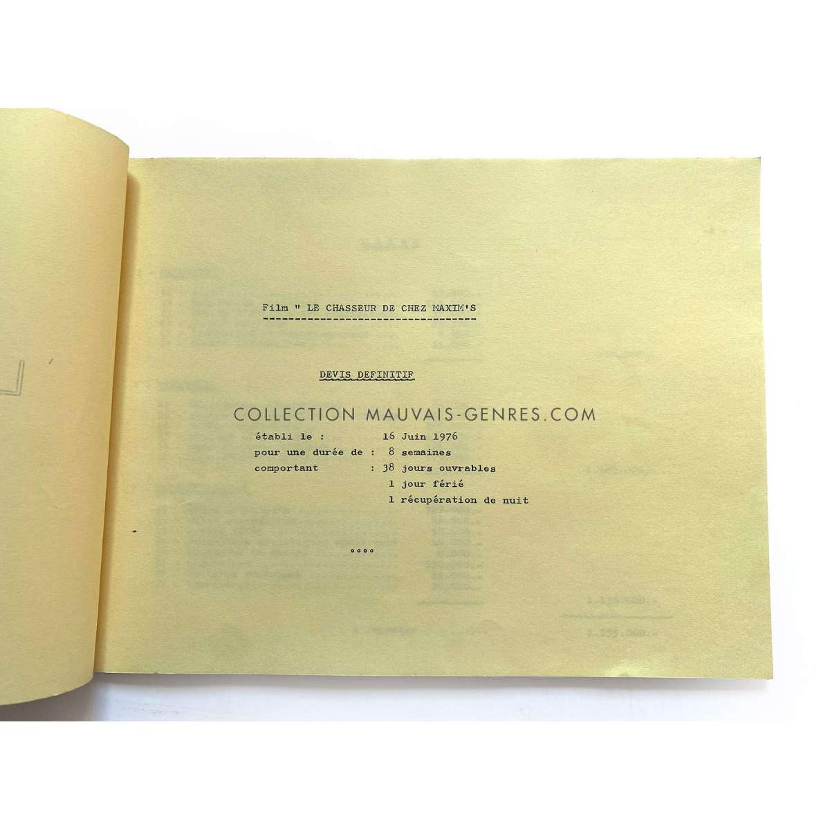 Documents de production de LE CHASSEUR DE CHEZ MAXIM'S (1976 - Claude Vital, Michel Galabru) - Format: 21x30 cm. environ. - Très bon état (C6) devis et planning ayant appartenu à la responsable de production du film O. Darrigol (La Veuve Coudert…).