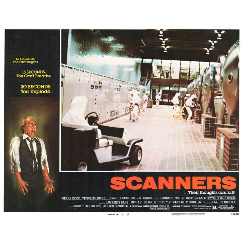 Scanners est un film d'horreur canadien de 1981 réalisé par David Cronenberg avec Michael Ironside et Patrick Mcgoohan. David Cronenberg est un réalisateur canadien, né le 15 mars 1943 à Toronto (Canada). Ses genres de prédilection sont l'horreur, le fantastique et la science-fiction. Son cinéma sonde les névroses et les phobies de la société occidentale, laissant libre cours au déchaînement de pulsions refoulées. Ses deux thèmes récurrents sont le double et la métamorphose.