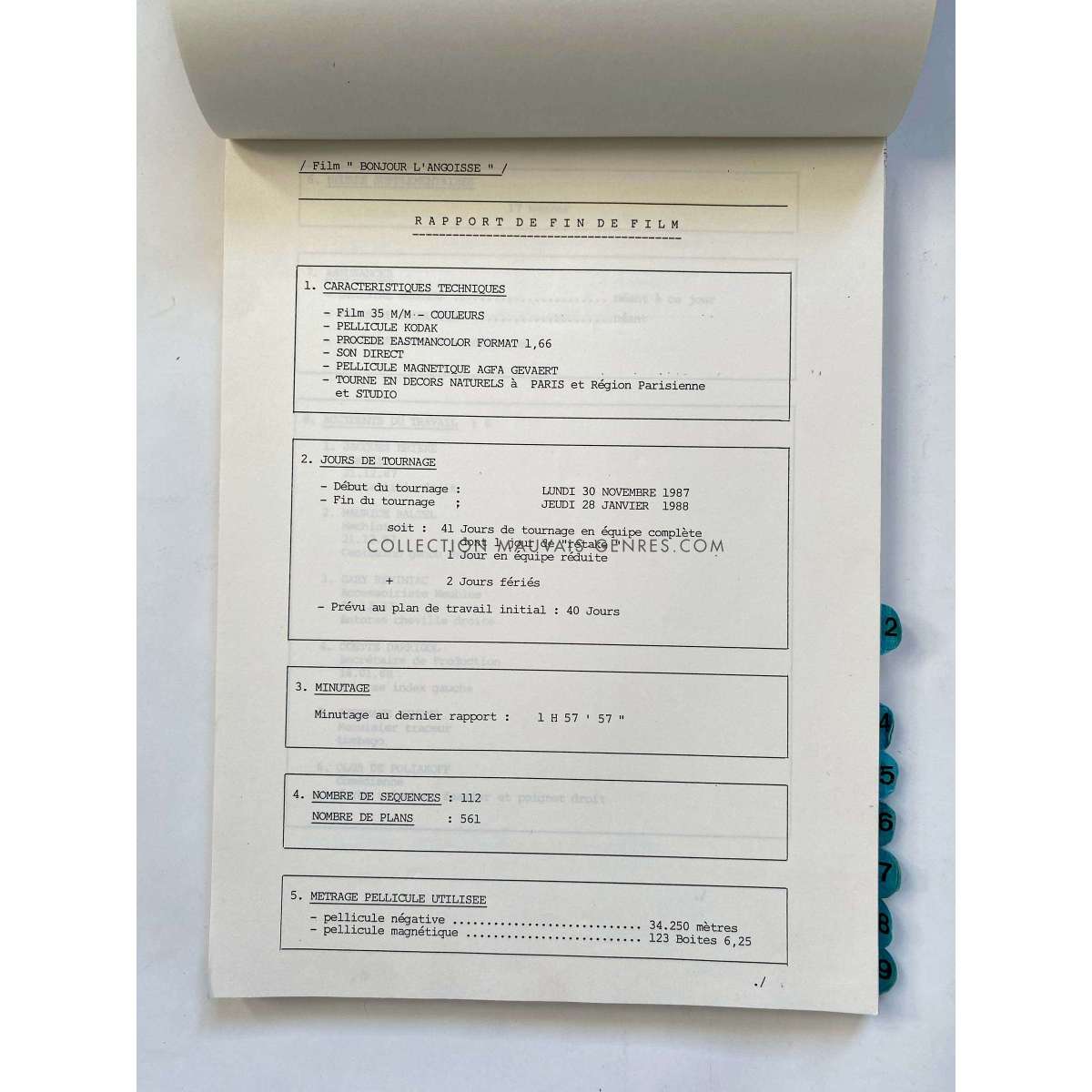 Bible de production de BONJOUR L'ANGOISSE (BONJOUR L'ANGOISSE - 1988 - Pierre Tchernia, Michel Serrault) - Format: 21x30 cm. environ. - Très bon état (C6) Rare Bible de production ayant appartenu à la responsable de production du film O. Darrigol (La Veuve Coudert…). Le lot comprend la bible et divers documents utilisés pour le tournage