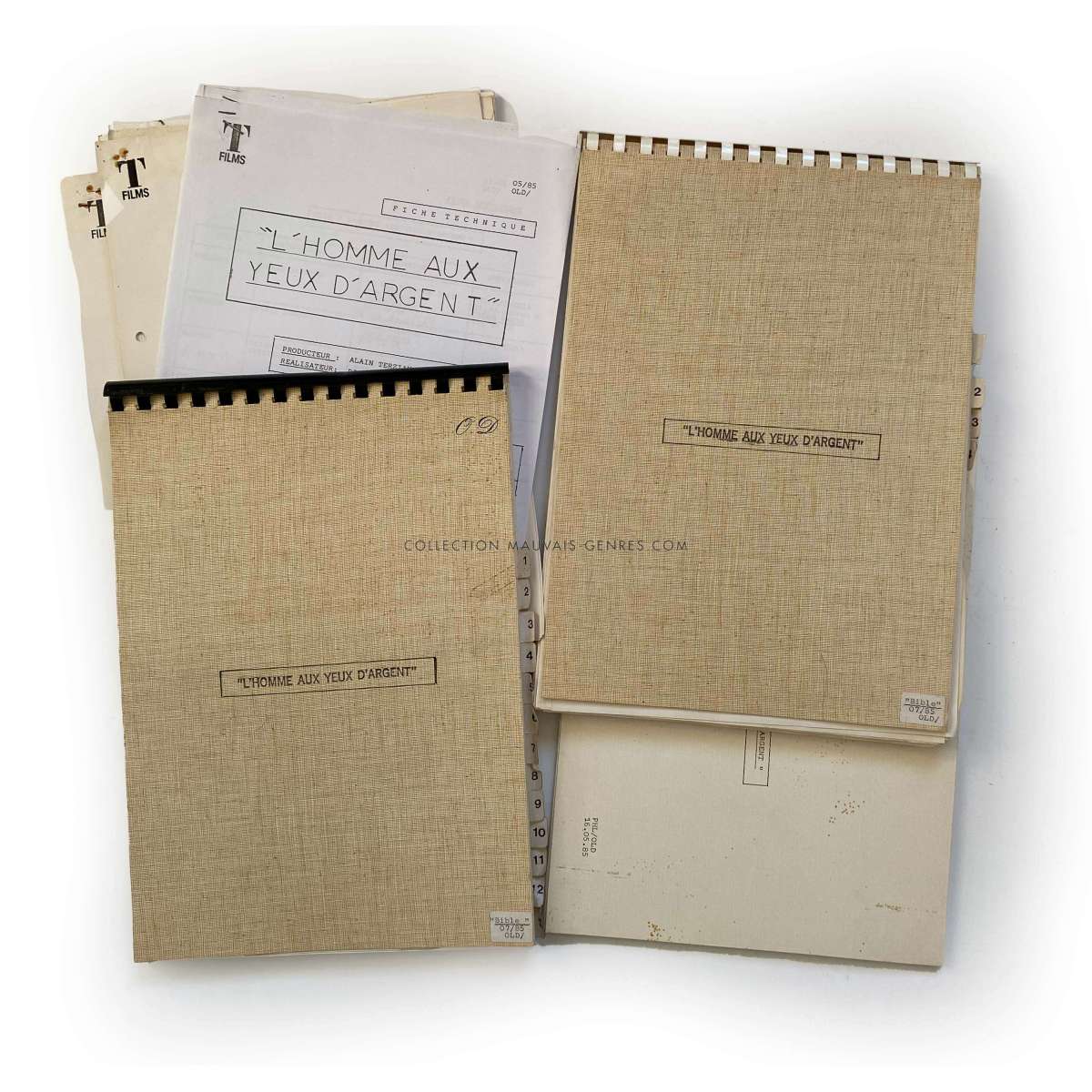 Bibles de production de L'HOMME AUX YEUX D'ARGENT (L'HOMME AUX YEUX D'ARGENT - 1985 - Pierre Granier-Deferre, Alain Souchon) - Format: 21x30 cm. environ. - Très bon état (C6) Rare Bible de production ayant appartenu à la responsable de production du film O. Darrigol (La Veuve Coudert…). Le lot comprend la bible et divers documents utilisés pour le tournage.