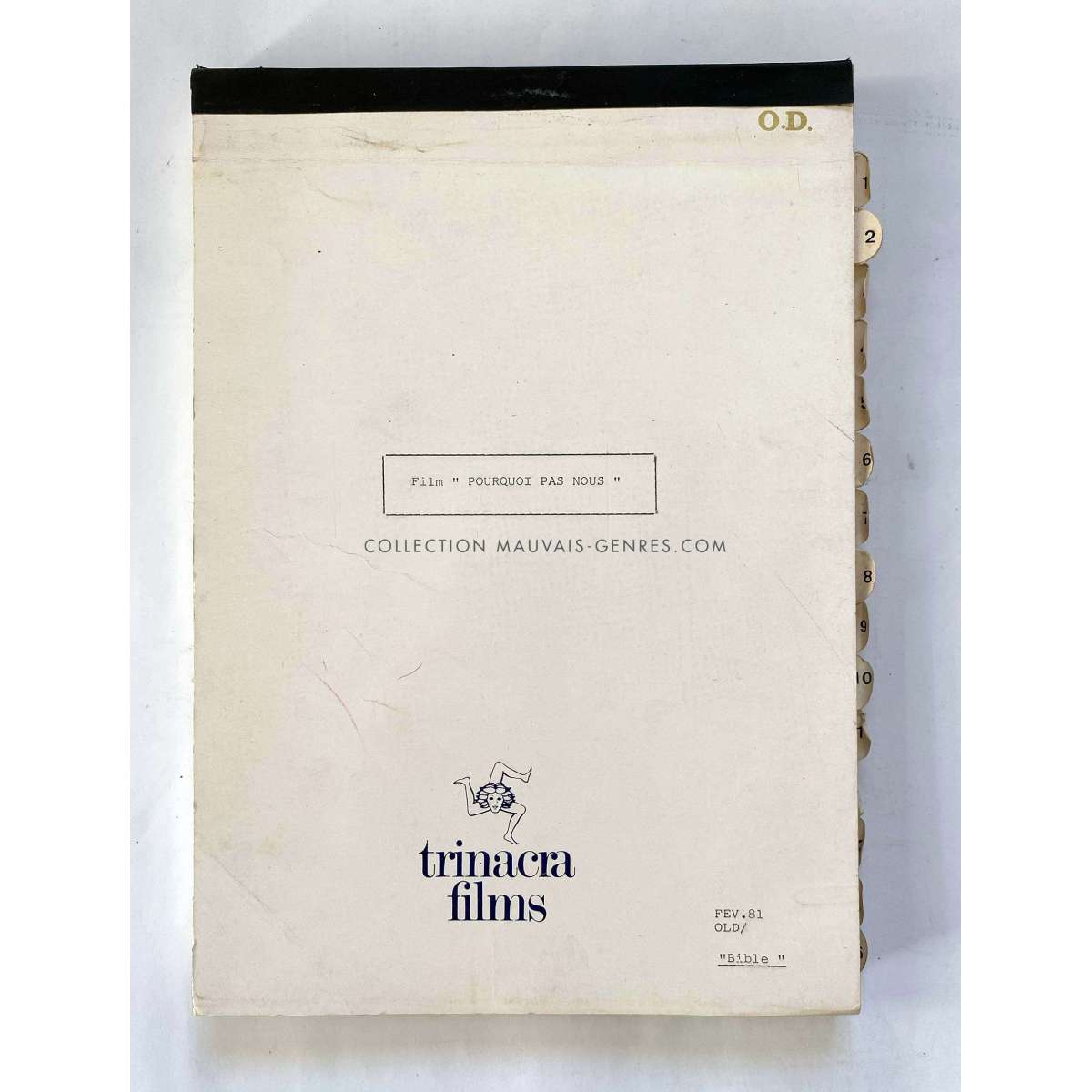 Bible de production de POURQUOI PAS NOUS (POURQUOI PAS NOUS - 1981 - Michel Berny, Aldo Maccione) - Format: 21x30 cm. environ. - Très bon état (C6) Rare Bible de production ayant appartenu à la responsable de production du film O. Darrigol (La Veuve Coudert…). Le lot comprend la bible et divers documents utilisés pour le tournage.